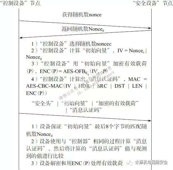 当一个“控制设备”想要发送一个消息到一个安全的“从设备”上,那么这个“控制设备”必须首先向这个“安全设备”请求一个随机数,然后使用这个随机数作为“消息认证码”MAC的一部分参与运算,并将其回复给“从设备”。当“从设备”返回随机数后,“控制设备”会选择自己的随机数,将该随机数与从“从设备”发送给“控制设备”的随机数组合起来,生成一个“初始向量”(Initialization Vector,IV)值。通过“初始向量”值,“控制设备”可以使用“初始向量”和“数据包加密钥”Kc加密数据包的有效载荷(简称P),然后使用“信息认证密钥”Km计算“消息认证码”。“消息认证码”的计算包括“初始向量”,“安全头”(HDR),“源节点ID”(SRC),“目的节点ID”(DST),“有效载荷的长度”(LEN)和“加密的有效载荷”(ENC(P))。这个交换过程如图8所示。