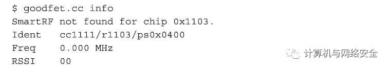 因为GoodFET设备为CC1111EMK设备提供电源,所以不需要为CC1111EMK提供电源就可以完成芯片固件的刷新。只要简单地将GoodFET设备插入到Linux操作系统主机的USB口上,很快就可以从CC1111芯片上获得该设备的基本信息,其命令格式及效果如下所示: