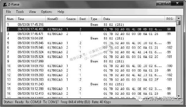 所有的工作完成以后,就可以开始运行Z-Force应用程序了。单击“选项(Options)|射频板(RF Boards)”菜单,分别选择和设置前面发送固件TX所对应的COM串口端口值和接收固件RX所对应的COM串口端口值。然后程序就做好了开始捕获Z-Wave网络上的通信数据包的准备,这时选择“工具(Tools)|开始捕获(Start Capture)”菜单。Z-Force程序就会显示所捕获到的数据包,其效果类似图13所示。单击“工具(Tools)|停止捕获(Stop Capture)”菜单就会停止当前的数据包捕获过程。