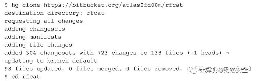 下一步,使用Mercurial工具中的hg程序,从RfCat项目中下载源代码,下载成功以后,从命令行切换到rfcat目录中,其操作步骤和命令效果如下所示: