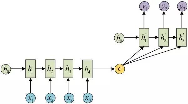 拿到c之后,就用另一个RNN网络对其进行解码,这部分RNN网络被称为Decoder。具体做法就是将c当做之前的初始状态h0输入到Decoder中: