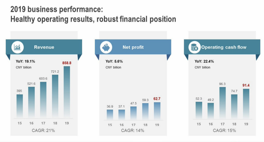 华为轮值董事长徐直军表示,2019年华为基本取得符合预期的业绩。2019年,华为实现全球销售收入8,588亿元人民币,同比增长19.1%,净利润627亿元人民币,同比增长5.6%,明显低于过去五年的年均增长率14%,经营活动现金流914亿元,同比增长22.4%。