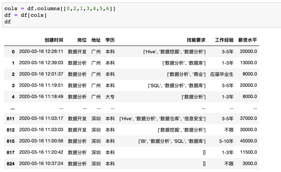在pandas中交换两列也有很多方法,以交换示例数据中地址与岗位两列为例,可以通过修改列号来实现