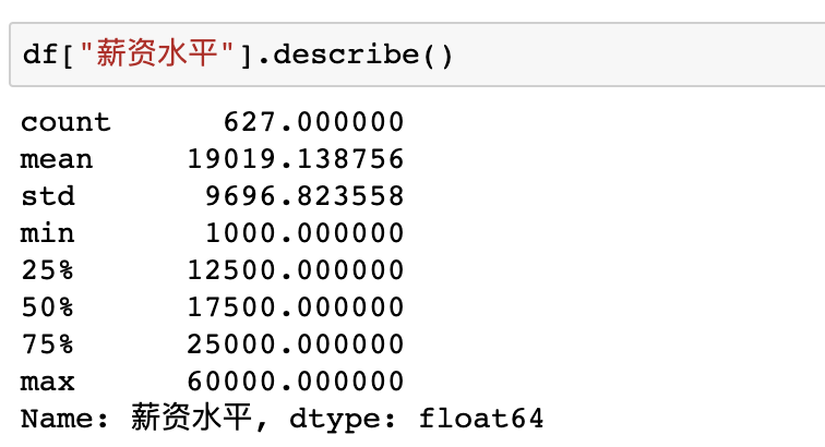 在pandas中也有现成的函数describe快速完成对数据的描述性统计,比如使用df["薪资水平"].describe()即可得到薪资列的描述性统计结果