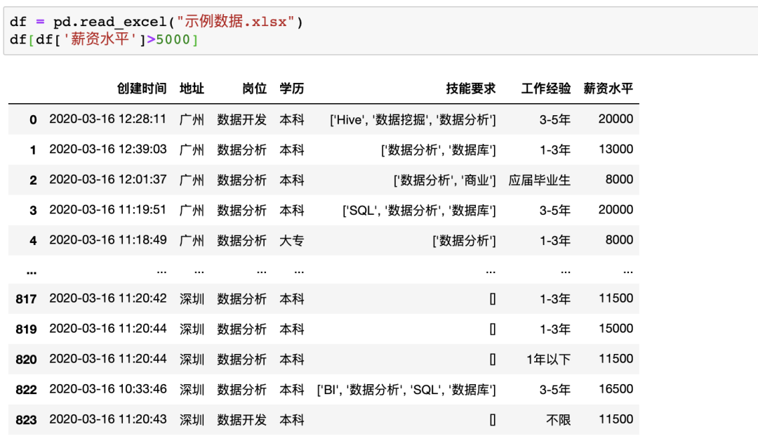 在Pandas中,可直接对数据框进行条件筛选,例如同样进行单个条件(薪资大于5000)的筛选可以使用df[df['薪资水平']>5000],如果使用多个条件的筛选只需要使用&(并)与|(或)操作符实现