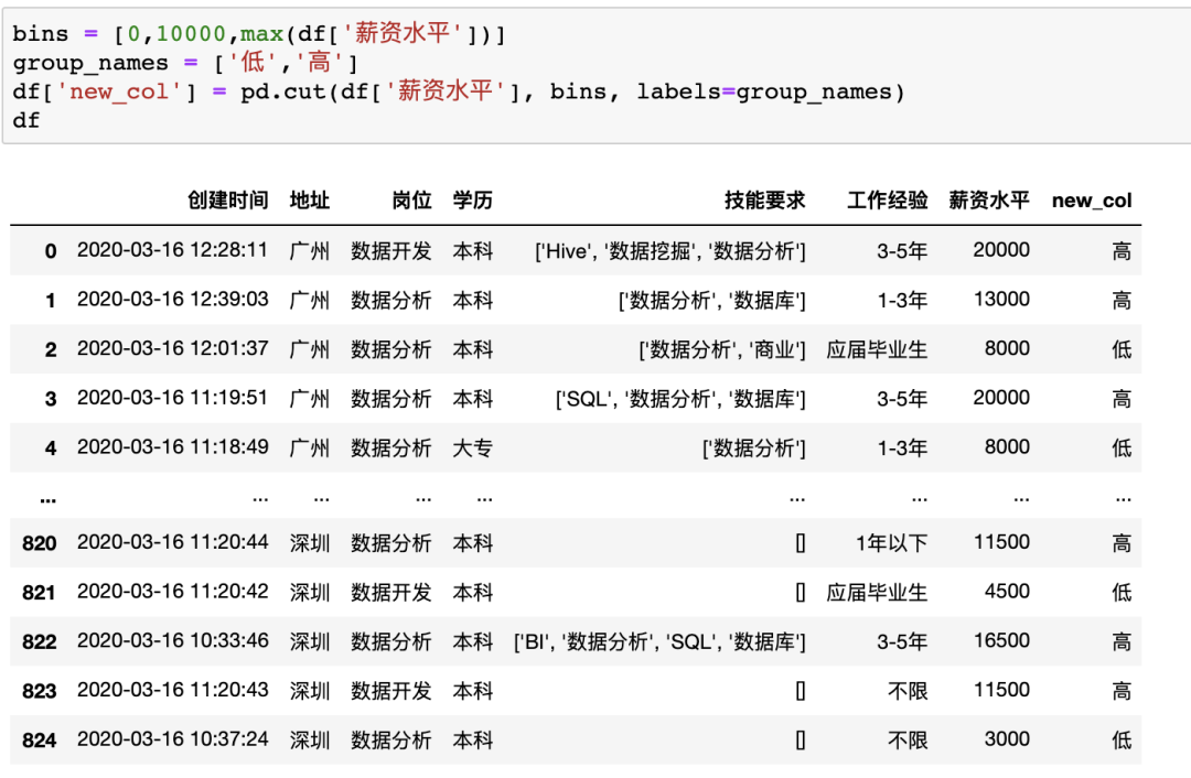 df['new_col'] = pd.cut(df['薪资水平'], bins, labels=group_names)