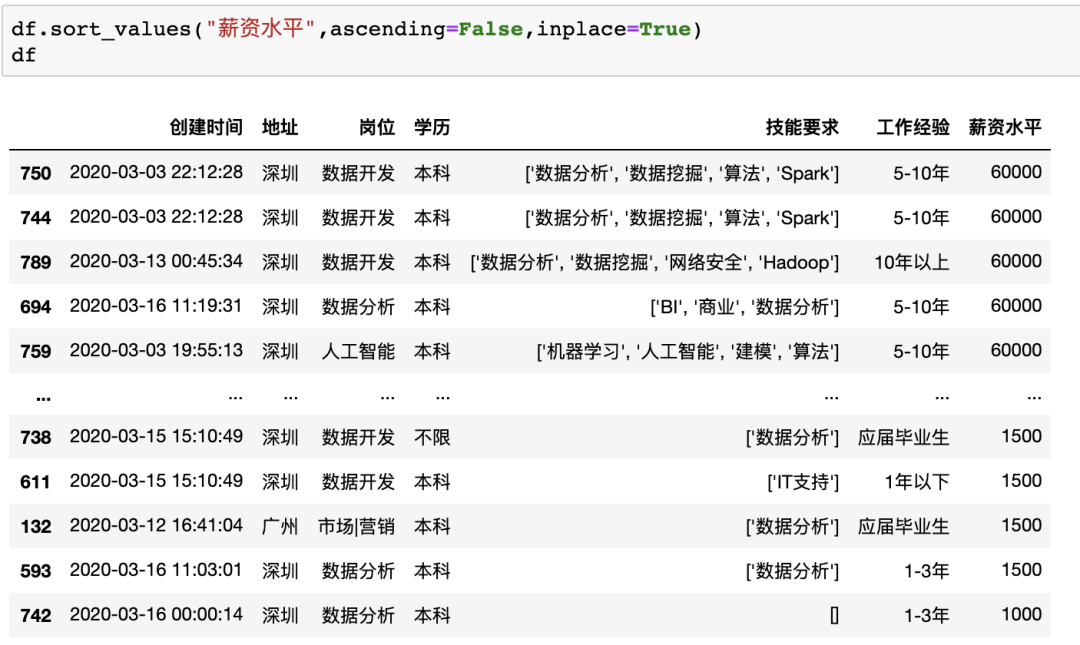 在pandas中可以使用sort_values进行排序,使用ascending来控制升降序,例如将示例数据按照薪资从高到低进行排序可以使用df.sort_values("薪资水平",ascending=False,inplace=True)