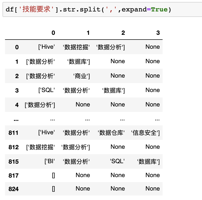 在Pandas中可以使用.split来完成分列,但是在分列完毕后需要使用merge来将分列完的数据添加至原DataFrame,对于分列完的数据含有[]字符,我们可以使用正则或者字符串lstrip方法进行处理,但因不是pandas特性,此处不再展开。