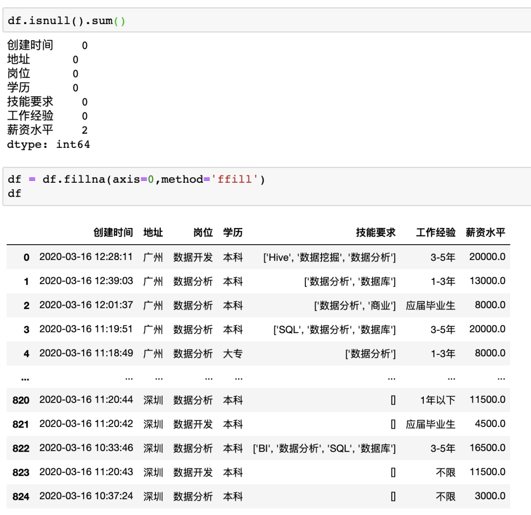在pandas中可以使用data.isnull().sum()来检查缺失值,之后可以使用多种方法来填充或者删除缺失值,比如我们可以使用df = df.fillna(axis=0,method='ffill')来横向/纵向用缺失值前面的值替换缺失值