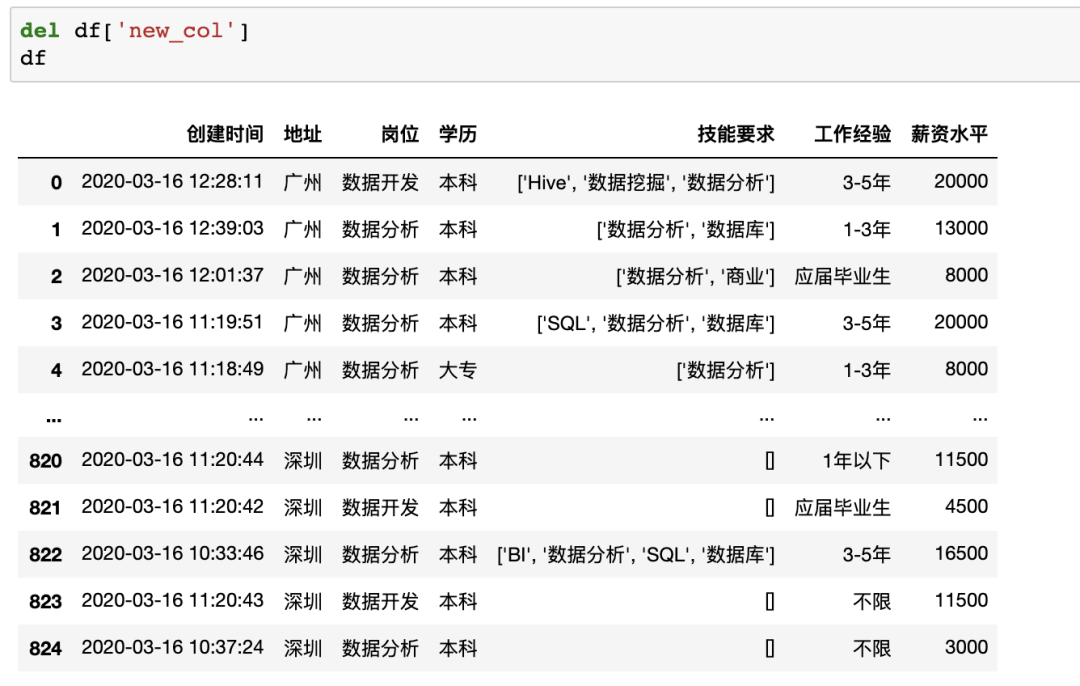 在pandas中删除数据也很简单,比如删除最后一列使用del df['new_col']即可