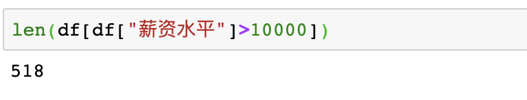 在Pandas中可以直接使用类似数据筛选的方法来统计薪资大于10000的岗位数量len(df[df["薪资水平"]>10000])