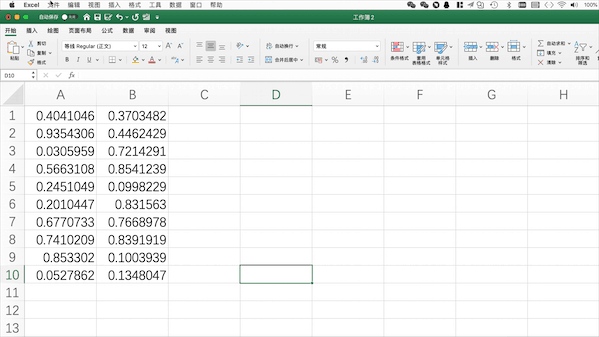 以生成10*2的0—1均匀分布随机数矩阵为例,在Excel中需要使用rand()函数生成随机数,并手动拉取指定范围