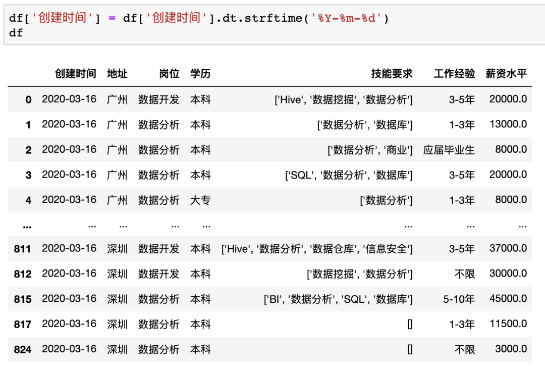 在Pandas中没有一个固定修改格式的方法,不同的数据格式有着不同的修改方法,比如类似Excel中将创建时间修改为年-月-日可以使用df['创建时间'] = df['创建时间'].dt.strftime('%Y-%m-%d')