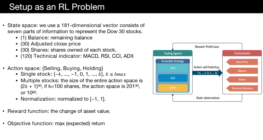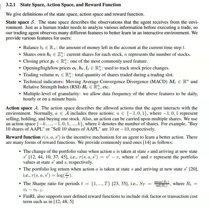 最后,FinRL的成功得益于对环境的定义, FinRL量化交易环境中:状态空间、动作空间和奖励函数的定义。