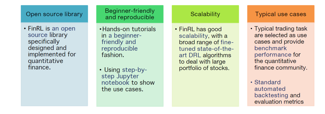 一个好的框架一定满足简单易用,高效稳定可拓展的特性,那么FinRL框架有哪些贡献或者说优点呢?如下图所示: