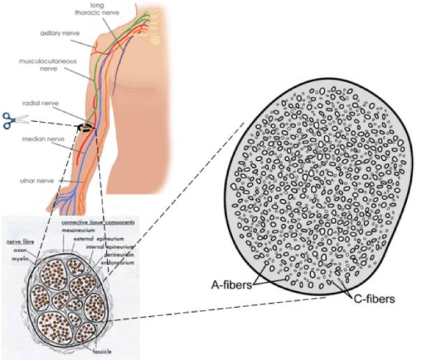 ►和其它神经相似,支配前臂侧面肌肤的肌皮神经(musculocutaneous nerve)的横断面会看到很多有膜隔开的神经纤维束。每束都含有粗细不等的神经纤维。最粗的是A-纤维,表面有髓鞘层层包裹。最细的就是C纤维,它没有髓鞘包裹,所以传递信号的速度最慢:每秒0.5至1.3米。