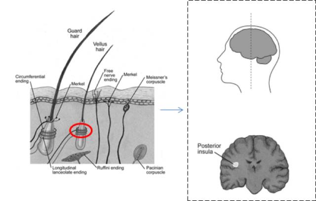 ►根据小鼠实验推测,人的C纤维传导的信号来自有毛皮肤中的毫毛毛囊根部的神经末梢。左图为有毛肌肤的神经传感器分布。几种神经末稍构成了毛囊周围的“篱笆”结构(红圈所示),其中有一种末稍来自C纤维。C纤维传感器被激活后,信号几经接力,最终点亮大脑中的后岛叶。右图显示了左侧后岛叶在脑中的位置。抚摸右侧有毛肌肤会激活左侧后岛叶,而抚摸左侧则激活右侧后岛叶。