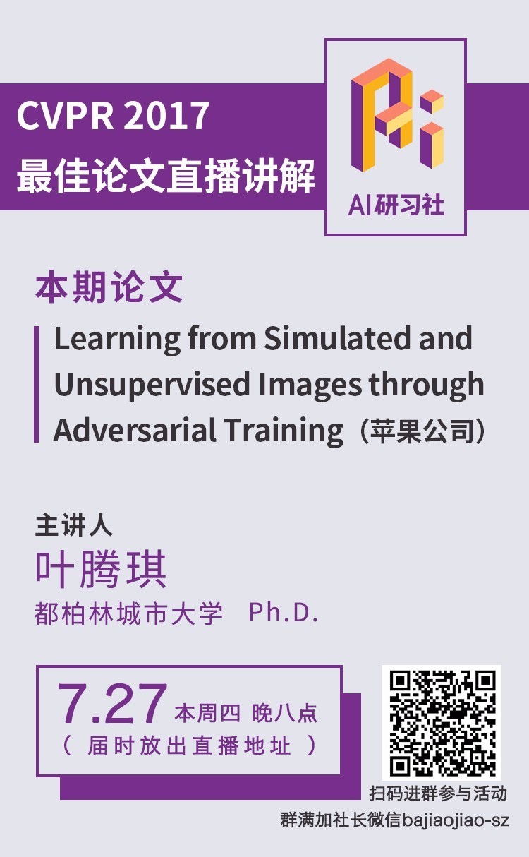 即 “《借助对抗训练,从模拟、无监督图像中学习》”,作者为 Ashish Shrivastava,Tomas Pfister,OncelTuzel,Joshua Susskind,Wenda Wang,Russell Webb。