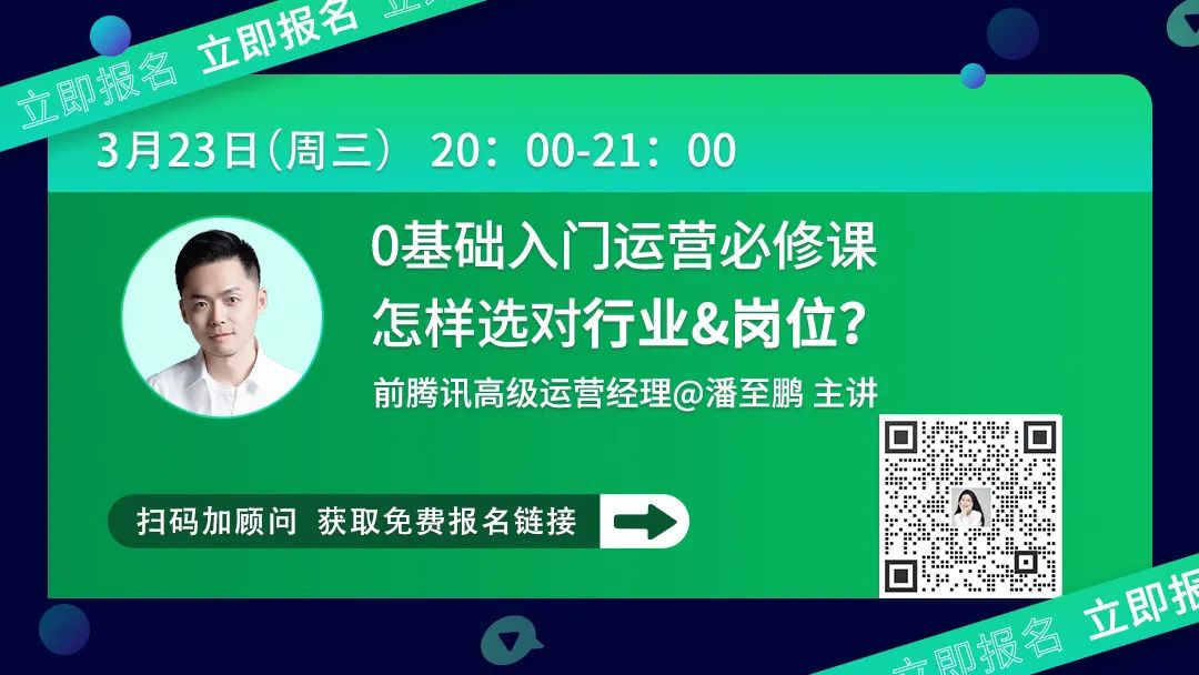 3月23日周三晚20点,前腾讯高级运营经理@潘至鹏,用17年运营经验教你如何选择适合自己的岗位,找到有前途的行业,提高能力拿下offer!