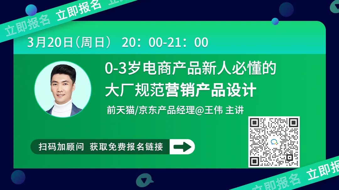3月20日(周日)晚8点,前天猫/京东产品经理@王伟老师亲授,1小时实例深度拆解大厂电商的规范营销产品设计,带你系统学习电商产品经理。