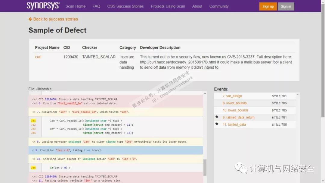 点击View Defect可以看到详细问题描述,现在以一个curl(一个利用URL语法在命令行方式下工作的开源文件传输工具)中的漏洞作为例子进行查看针对某问题的具体展示结果: