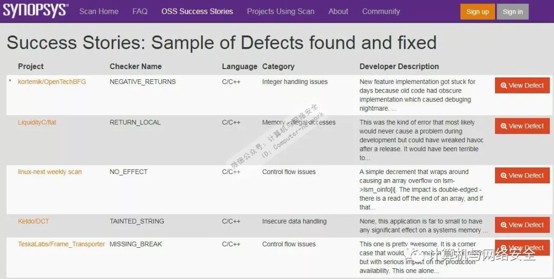 https://scan.coverity.com/o/oss_success_stories中包含甄选出通过Coverity发现的漏洞列表,如图2所示。