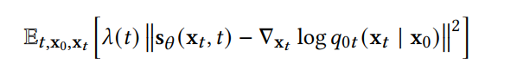 因此,要逆转扩散过程并生成数据,我们需要的唯一信息就是在每个时间点的分数函数。利用 score-matching 的技巧我们可以通过如下损失函数来学习分数函数: