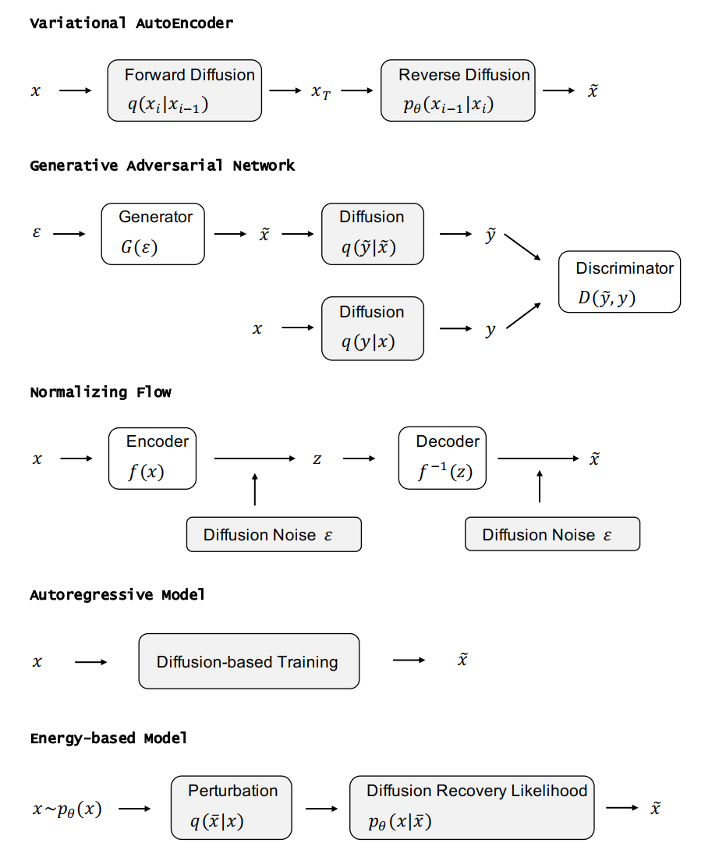 VAE,GAN,Autoregressive model, Normalizing flow, Energy-based model 和扩散模型的联系如下图所示: