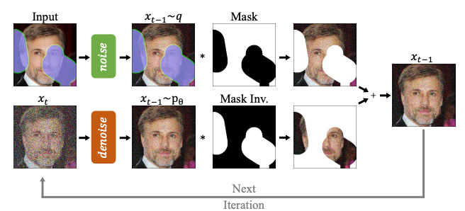 在本节中,我们分别介绍了扩散模型在计算机视觉、自然语言处理、波形信号处理、多模态学习、分子图生成、时间序列以及对抗学习等七大应用方向中的应用,并对每类应用中的方法进行了细分并解析。例如在计算机视觉中可以用 diffusion model 进行图像补全修复(RePaint):