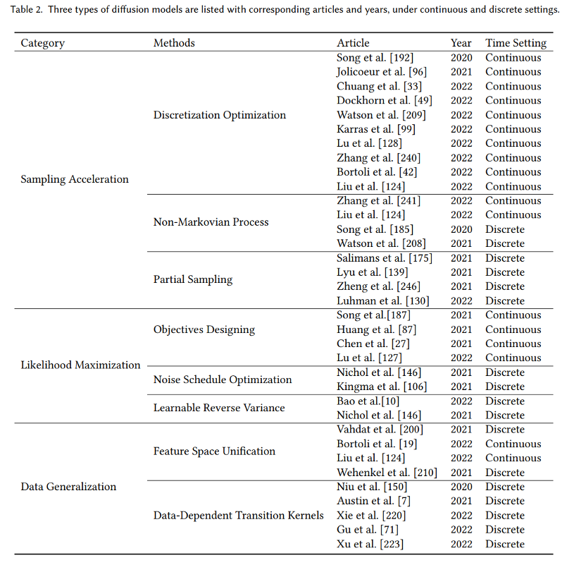 在应用时,为了让新样本的质量达到最佳,扩散模型往往需要进行成千上万步计算来获取一个新样本。这限制了 diffusion model 的实际应用价值,因为在实际应用时,我们往往需要产生大量的新样本,来为下一步处理提供材料。研究者们在提高 diffusion model 采样速度上进行了大量的研究。我们对这些研究进行了详细的阐述。我们将其细化分类为三种方法:Discretization Optimization,Non-Markovian Process,Partial Sampling。