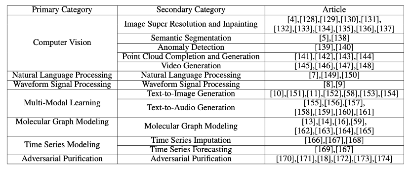 在分析完三类扩散模型后,我们将介绍其他的五种生成模型 GAN,VAE,Autoregressive model, Normalizing flow, Energy-based model。考虑到扩散模型的优良性质,研究者们已经根据其特性将 diffusion model 与其他生成模型结合,所以为了进一步展现 diffusion model 的特点和改进工作,我们详细地介绍了 diffusion model 和其他生成模型的结合的工作并阐明了在原始生成模型上的改进之处。Diffusion model 在诸多领域都有着优异的表现,并且考虑到不同领域的应用中 diffusion model 产生了不同的变形,我们系统地介绍了 diffusion model 的应用研究,其中包含如下领域:计算机视觉,NLP、波形信号处理、多模态建模、分子图建模、时间序列建模、对抗性净化。对于每个任务,我们定义了该任务并介绍利用扩散模型处理任务的工作,