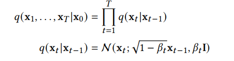 这说明前向链是马尔可夫过程,x_t 是加入 t 步噪音后的样本,β_t 是事先给定的控制噪声进度的参数。当