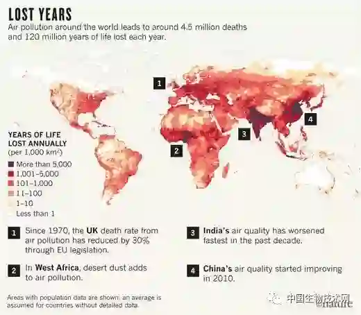 首先,空气污染来源多样。取暖和烹饪尤其是使用燃料炉具和火炉是低收入国家头号污染源,是导致死亡率增加的重要因素。这种因素的污染物几乎每年可导致135万人死亡。农业生产是空气污染的第二大来源,是导致90万人死亡的污染因素。农业污染一方面来自粪便释放的氨,另一方面是化肥与硫酸和硝酸结合成硫酸铵和硝酸铵释放到空气中形成PM2.5。发电、工业和交通也能产生臭氧和PM2.5。