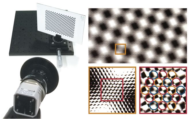 本文提出了一种利用原始图像对多焦距全光相机的几何标定方法。多焦距全光相机的特点在于具备数种在空间上与相机传感器相对齐的微透镜,使得能产生不同放大倍率的微图像。这种多透镜设计在图像处理的计算量上具有优势,但是却使得标定过程较为复杂。我们的方法能检测微透镜的类型、检索出微透镜的空间排列,并且能估计出相机的内参及外参,从而全面刻画具体的相机类型。受经典的针孔相机标定的启发,我们的算法在棋盘格角点上进行开展,其中角点的检索是通过用户的微图像角点检测器实现的。实验设备及原始图像如下图所示: