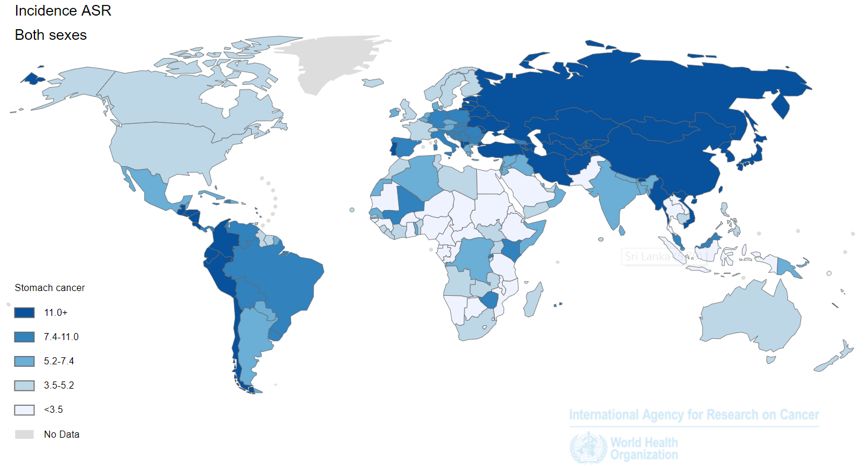 谈起胃癌,我们一定都不陌生。胃癌是世界范围内最常见的癌症之一,但其发病率(incidence)因地理区域而不同(图2),东亚、东欧和南美洲发病率最高(其中日本发病率最高达30/10万人)。