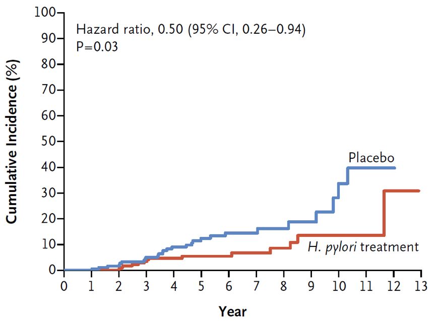 ►图5 通过幽门螺杆菌治疗预防异时性胃癌(来源:NEJM)