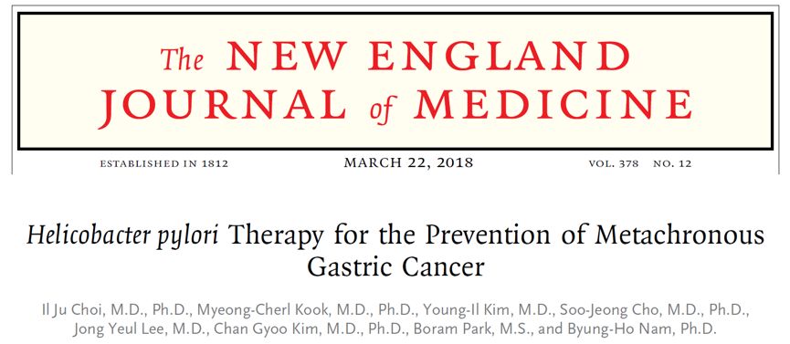 2. Il Ju Choi et al. Helicobacterpylori Therapy for the Prevention of Metachronous Gastric Cancer. N ENGL JMED. 2018, 378;12