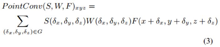 其中,W 和 F 均为连续函数,(x, y, z) 是 3D 参考点的坐标,(δx,δy,δz) 表示邻域 G 中的 3D 点的相对坐标。(2) 式可以离散化到一个离散的 3D 点云上。同时,考虑到 3D 点云可能来自于一个不均匀采样的传感器,为了补偿不均匀采样,我们提出使用逆密度对学到的权重进行加权。PointConv 可以由下式表示,
