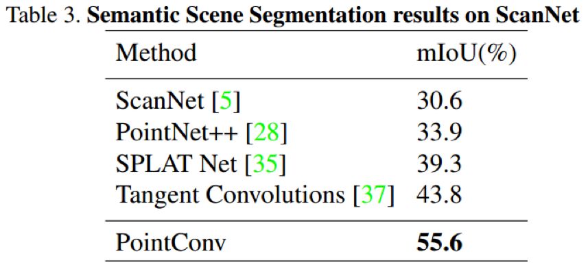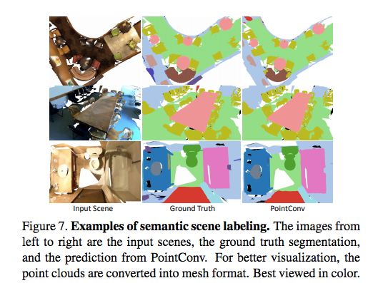为了说明 PointConv 的有效性,我们在常用的 3D 点云数据库上进行了测试,包括 ModelNet40,ShapeNet 和 ScanNet. 同时,为了说明 PointConv 是可以和图像 CNN 进行等价,我们在 CIFAR10 上进行了测试。这里我们重点介绍在 ScanNet 上的测试结果,更多实验结果请参考论文原文。如表 3 所示,仅使用 4 层 PointConv 网络,即可在场景的的语义分割测试中达到远好于其他算法的效果,达到了当前最优水平。图 7 给出了室内场景语义分割的一些可视化结果。