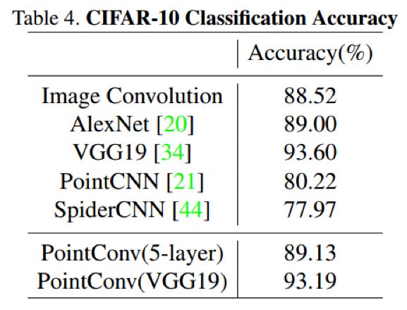 为了说明 PointConv 可以等价于图像上的 CNN,我们在 CIFAR10 上进行了测试。首先,将 CIFAR10 的图像像素转变为网格状排列的点云,再使用 PointConv 进行分类。表格 4 给出了 PointConv 与其他 3D 点云算法和图像 CNN 的分类精度对比。可以看到,5 层的 PointConv 可以达到和 AlexNet(5 层 CNN)相似的精度,同时,PointConv(VGG) 也可以达到和 VGG 相似的分类精度。与此同时,其他的 3D 点云算法,如 PointCNN 等,则仅能取得 80% 左右的分类精度。这项实验说明了 PointConv 可以取得与图像 CNN 同等水平的学习效果。