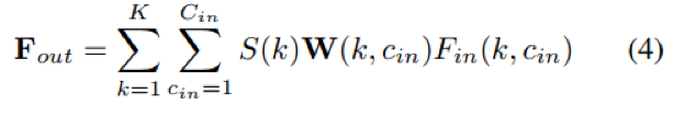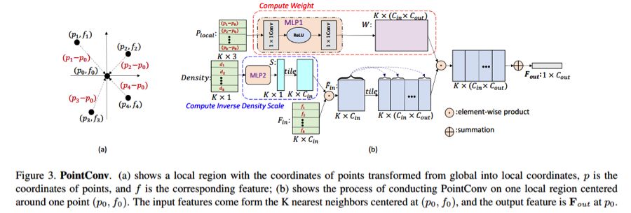 图 3 展示了在一个由 K 个 3D 点组成的邻域上进行 PointConv 的流程。图中,C_in 和 C_out 表示输入和输出的特征的维度,k, c_in, c_out 表示索引。对于 PointConv 来说,输入由三部分组成:3D 点的相对坐标 P_local,密度 Density 和特征 F_in。3D 点的相对坐标 P_local 经过连续函数 MLP1 之后可以得到对应的每一个点的特征的权重 W;而密度 Density 经过 MLP2 之后得到逆密度系数 S;在得到权重 W, 逆密度系数 S 以及输入的特征 F 之后,可以利用下式进行卷积,以得到输出特征 F_out: