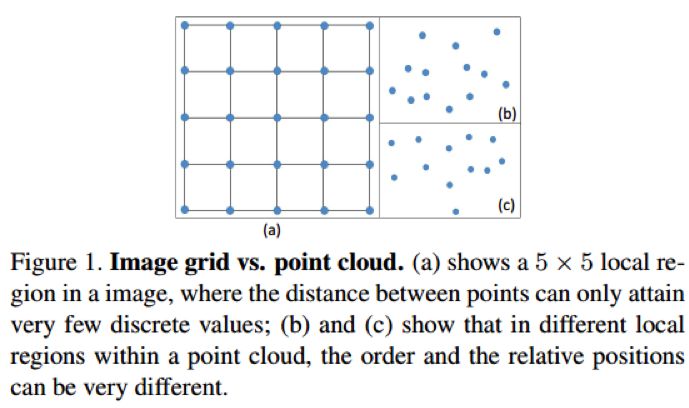 3D 点云数据的表达方式与图像完全不同。如图 1 所示,不同于图像,3D 点云通常由一些 3D 点组成。3D 点之间没有前后顺序之分,因此,在 3D 点云上的卷积操作应具有排列不变性,即改变 3D 点集中点顺序不应影响卷积结果。此外,点云上的卷积操作应适应于不同形状的邻域。