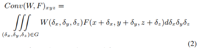 为满足这些要求,在 3D 空间中,可以把连续卷积算子的权重看作关于一个 3D 参考点的局部坐标的连续函数。如下式所示: