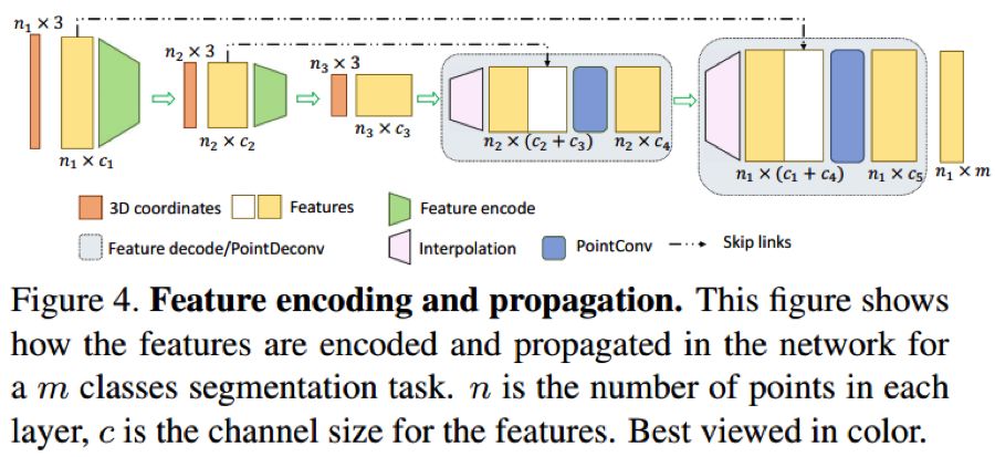 在分割任务中,将信息从粗糙层传递到精细层的能力非常重要。由于 PointConv 可以实现标准卷积操作,因此将 PointConv 扩展为 PointDeconv 是很顺理成章的。PointDeconv 由两部分组成:插值和 PointConv。首先,使用一个线性插值算法来得到精细层的特征的初始值,再在精细层上进行一个 PointConv 进行优化特征,从而获得较高精度的特征值。图 4 展示了反卷积操作的具体流程。
