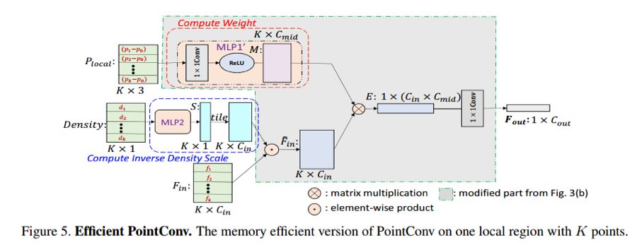 具体的证明可以参考原论文。根据 Lemma 1 重新实现 PointConv,可实现完全相同的卷积操作,但大大减少内存消耗。采用 1 中相同的配置,单层卷积操作的内存占用将由 8G 缩小为 0.1G 左右,变为原来的 1/64. 图 5 展示了高效的 PointConv 卷积操作。