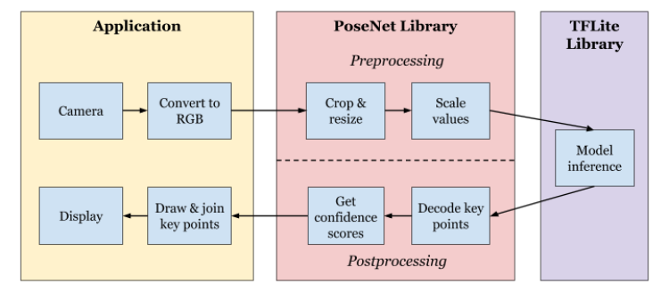 与现有的以 JAVA 写的安卓示例相反,PoseNet 示例应用程序是在 Kotlin 上开发的。开发此应用程序的目的为了让所有人都能以最小的支出轻松地使用 PoseNet 模型。这个示例应用程序包括了一个 PoseNet 库,它抽离了模型中的复杂性。以下的图表展示了应用程序、PoseNet 库和 TensorFlow Lite 库的工作流。
