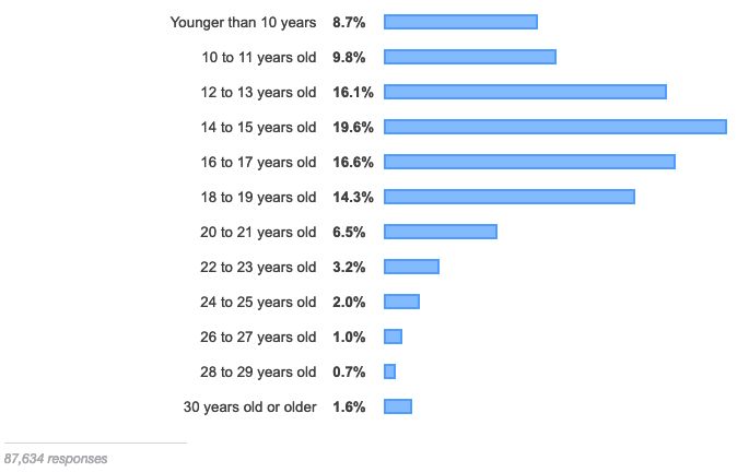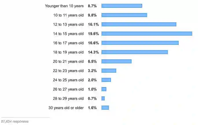 我们询问受访者他们第一次写代码或程序的年龄,无论是做网页还是写 hello world。总的来说,超过一半的受访者表示他们在 16 岁时就写出了他们的第一行代码。