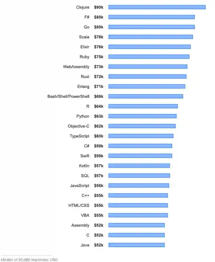 根据 Stack Overflow 的调查,在全球范围内,使用 Clojure、F# 和 Go 语言的程序员薪酬最高,薪酬中位数超过 70000 美元。而占比例最大的 Java 和 C 语言开发者薪酬较低,在所有语言中垫底。