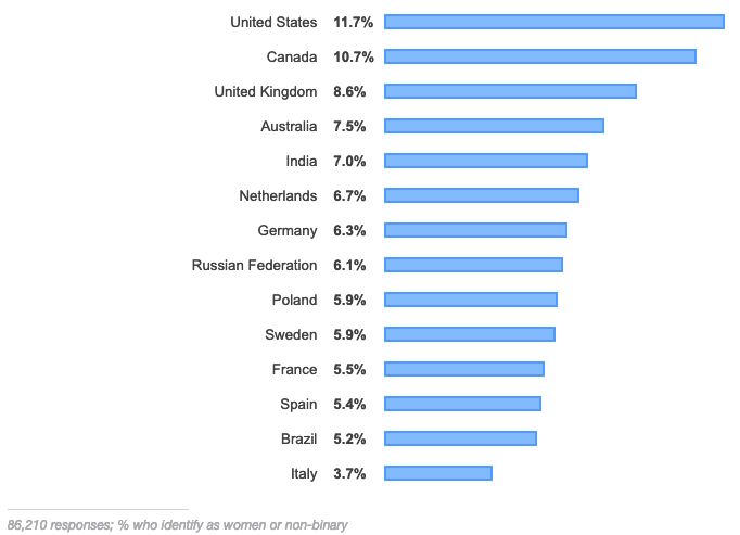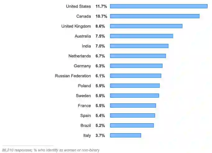受访者中,全球而言 90% 的开发者是男性。在美国,11% 的受访者是女性,高于去年的 9%。